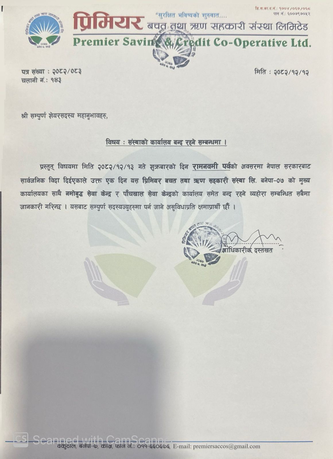 काभ्रे जिल्लाको सुन्दर र ऐतिहासिक व्यापारिक नगर बनेपामा सहकारी ऐन बमोजिम साविक प्रिमियर बचत तथा ऋण सहकारी संस्था लि. र आयाम बचत तथा ऋण सहकारी संस्था लि. एकीकरण भई हाल बनेको प्रिमियर बचत तथा ऋण सहकारी संस्था लि. ,(द.नं.१७०४/०६७/०६८) बागमती प्रदेश सहकारी तथा गरिबी निवारण मन्त्रालय अन्तर्गतको सहकारी महाशाखाबाट वित्तीय(बचत तथा ऋण) कारोबार गर्न मान्यता प्राप्त सहकारी संस्था हो| बैंकिंग, वित्तीय क्षेत्र तथा अन्य विभिन्न पेशा ब्यबसायमा अनुभव र दक्षेता प्राप्त ब्यक्तित्वहरुको ब्यबस्थापनमा संचालित यस संस्थाले सदस्यहरुको आर्थिक एबं सामाजिक बिकासमा बिशेष योगदान पुर्याउने उद्येश्य राखेको छ| सहकारीका मूल्य, मान्यता र सिदान्तहरु आत्मसाथ गर्दै वर्तमान प्रतिस्पर्धी समयमा सदस्यहरुलाई उत्कृष्ट सेवा सुबिधा प्रदान गरि निक्षेपमा आकर्षक ब्याज प्रदान गर्नुका साथै सदस्यहरुको आर्थिक एबं ब्यबसायिक बिकासका लागि सरल र सुलभ रुपमा कर्जा प्रवाह गर्ने संस्थाको ध्यय रहेको छ| आगामी दिनमा यस संस्थाले आफ्नो सदस्यहरुमा चुस्त रुपमा अझ बढी सुविधाहरु र बृहत कारोबारको नमुना प्रदान गर्ने लछ्य लिएको र सो अनुरुप कार्यहरु गरिरहेको जानकारी गराउन चाहन्छौ|